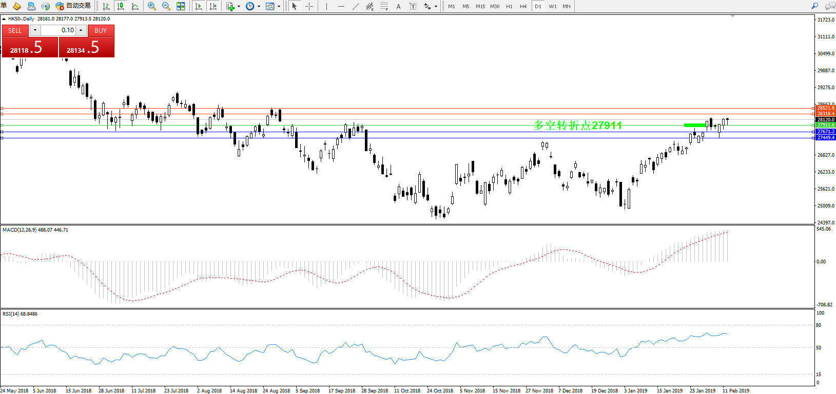 香港恒生指数低开后震荡走高,午后围绕平盘线整理,截至收盘微涨0.1%,报28171.33点。亚洲股市普涨,据证券时报报道,MSCI明晟回应扩容A股称,市场咨询结果将在31日前公布,现阶段不发表评论。据此前安排,MSCI明晟计划分两阶段将A股大盘股纳入因子从5%扩大到20%,实施时间将分别在20195月和8月,另外计划在20205月一次性将A股小盘股纳入因子扩大至20%
