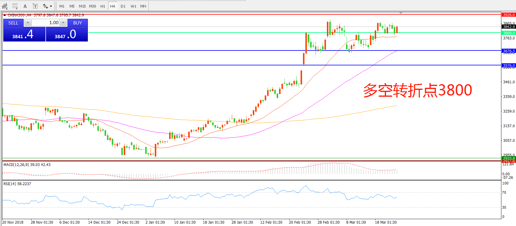 4小时图看,中华指数CHINA300近期呈现高位盘整态势,整体形态依然偏多,均线系统呈多头排列, MACD红柱增加,RSI指标拐头,日内延续上行概率较大。