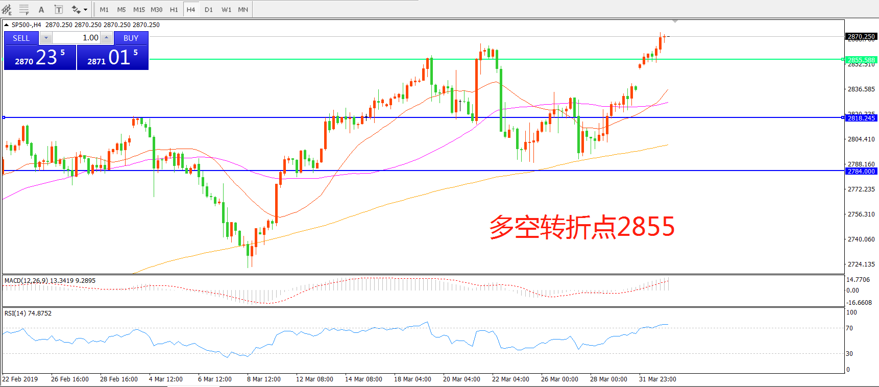 4小时图看,标普500以200均线为依托逐阶上行,21周期均线上穿55均线形成金叉, MACD红柱增加,RSI拐头向上,日内走势震荡偏多。