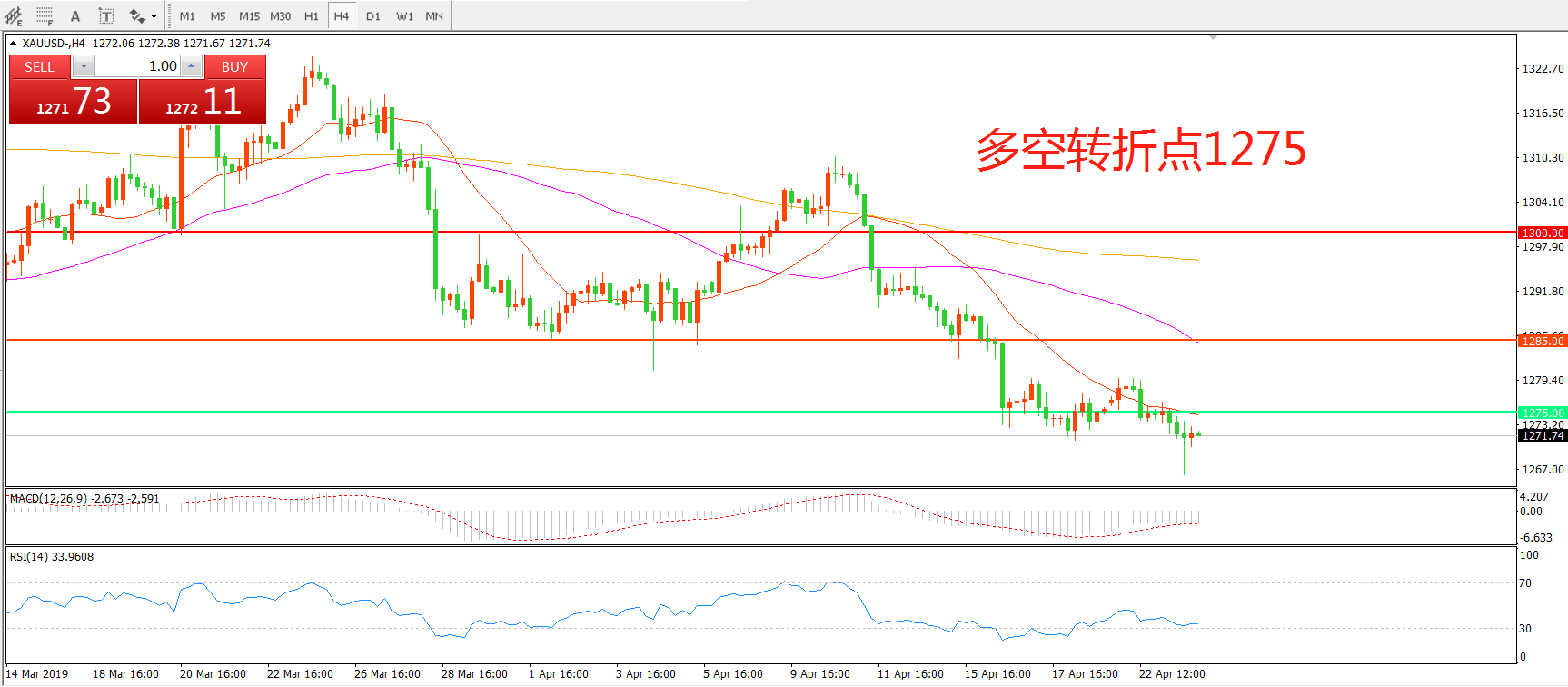4月23日周二,美国数据表现突出,欧美贸易摩擦引发市场担忧情绪共同提振了美元指数的表现。随着美元高位暴走,现货黄金在巨量抛盘打压下一度跌破1270,创下去年12月底以来的新低,最终收报1271.92美元/盎司。