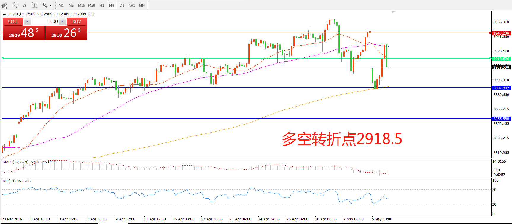 4小时图看,标普500触碰55周期均线后快速回落,整体走势偏弱,21均线下压成为上方阻力,MACD绿柱增加,日内重点关注2918.5一线得失。