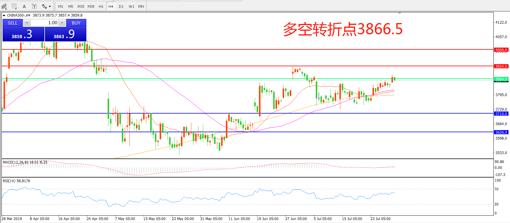 4小时图看,沪深300指数延续窄幅震荡,均线系统粘合形成支撑,RSI指标走平,日内若能突破3866.5一线阻力,整体将进一步上行。