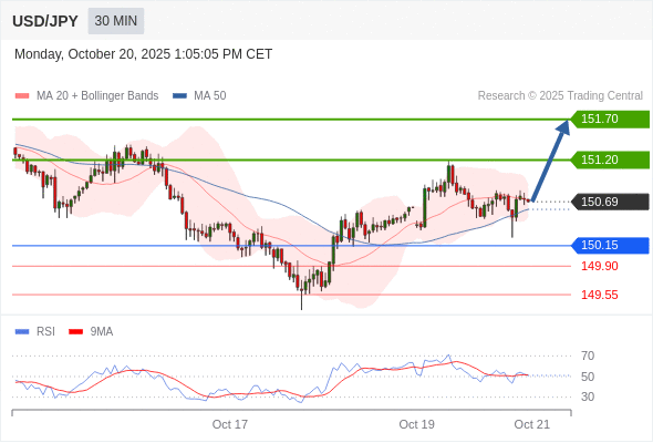 在 150.35 之上,看涨,目标价位为 151.20 ,然后为 151.70 。
