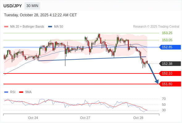 在 152.85 之下,看跌,目标价位为 152.10 ,然后为 151.80 。