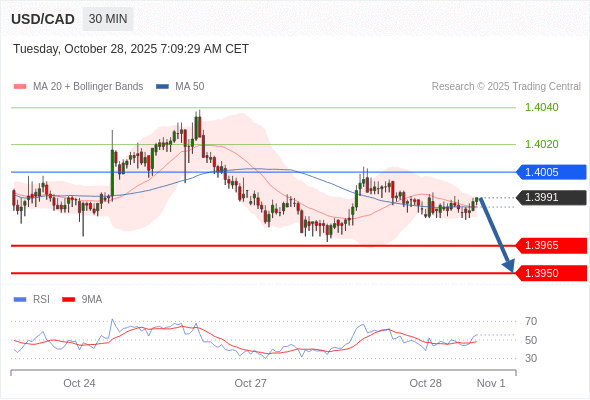 在 1.4005 之下,看跌,目标价位为 1.3965 ,然后为 1.3950 。