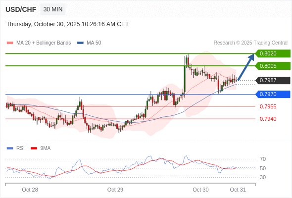 美元/瑞郎 当日内: 在0.7970之上,看涨。