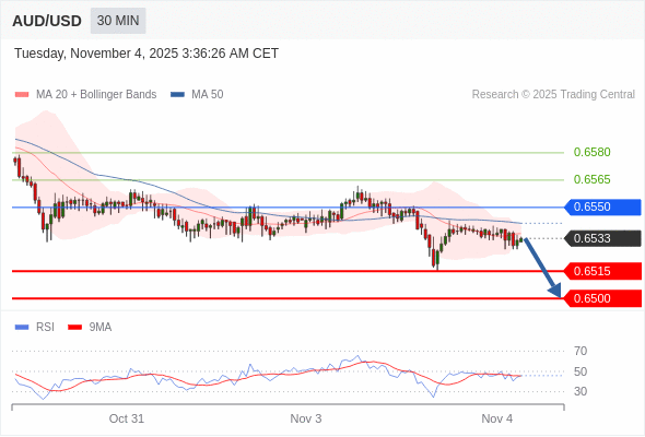 在 0.6550 之下,看跌,目标价位为 0.6515 ,然后为 0.6500 。