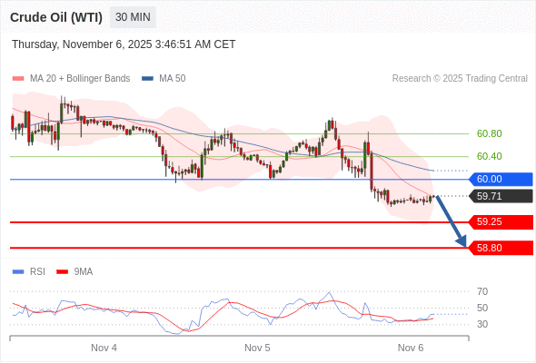 交易策略: 在 60.00 之下,看跌,目标价位为 59.25 ,然后为 58.80 。