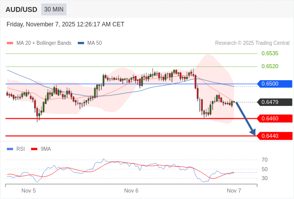 在 0.6500 之下,看跌,目标价位为 0.6460 ,然后为 0.6440 。