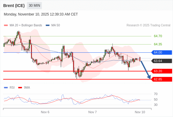 交易策略: 在 64.00 之下,看跌,目标价位为 63.20 ,然后为 62.85 。