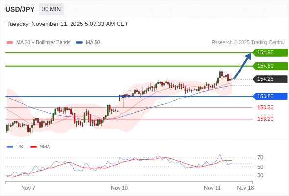 在 153.80 之上,看涨,目标价位为 154.60 ,然后为 154.95 。
