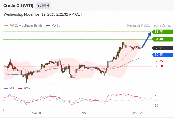在 60.65 之上,看涨,目标价位为 61.40 ,然后为 61.75 。