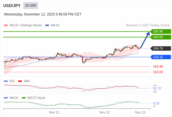 美元/日元 当日内 : 看涨,当 154.15 为支撑位,目标定在155.96。