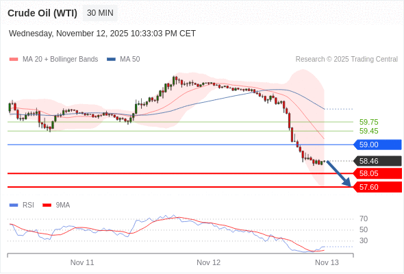 在 59.00 之下,看跌,目标价位为 58.05 ,然后为 57.60 。
