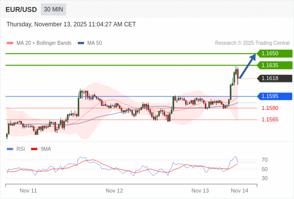 在 1.1595 之上,看涨,目标价位为 1.1635 ,然后为 1.1650 。