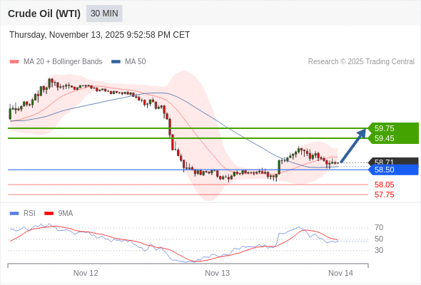 在 58.50 之上,看涨,目标价位为 59.45 ,然后为 59.75 。