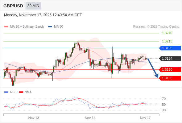 在 1.3195 之下,看跌,目标价位为 1.3130 ,然后为 1.3105 。