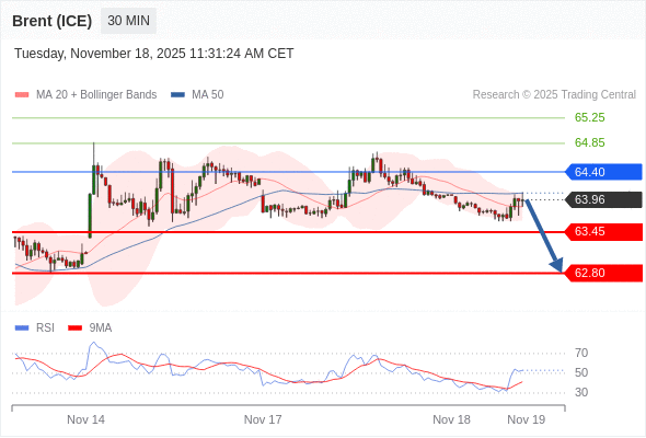 在 64.40 之下,看跌,目标价位为 63.45 ,然后为 62.80 。