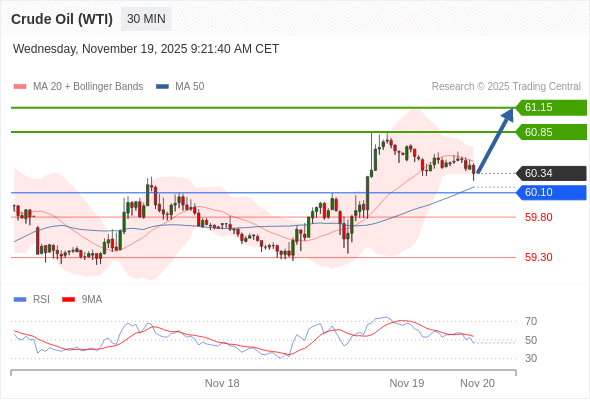 在 60.10 之上,看涨,目标价位为 60.85 ,然后为 61.15 。