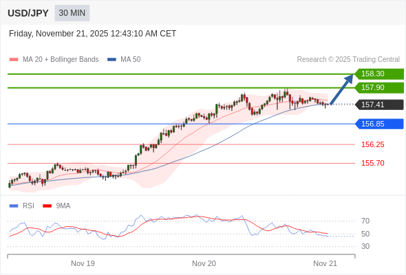 在 156.85 之上,看涨,目标价位为 157.90 ,然后为 158.30 。