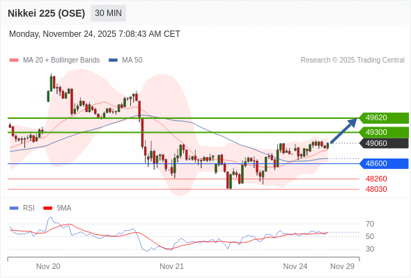 日经225股指期货 (OSE) 当日内: 在48600之上,看涨。