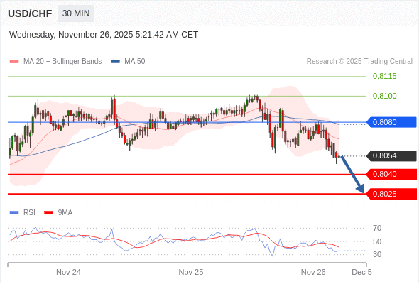 在 0.8080 之下,看跌,目标价位为 0.8040 ,然后为 0.8025 。