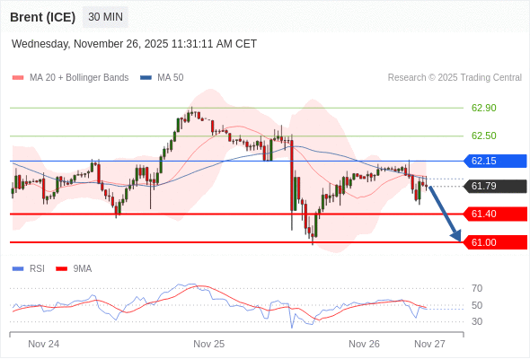 交易策略: 在 62.15 之下,看跌,目标价位为 61.40 ,然后为 61.00 。