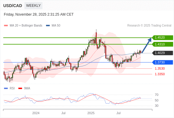 在 1.3730 之上,看涨,目标价位为 1.4310 ,然后为 1.4520 。