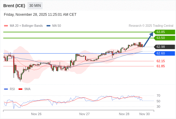 在 62.60 之上,看涨,目标价位为 63.50 ,然后为 63.85 。