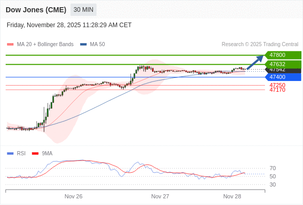 在 47400 之上,看涨,目标价位为 47632 ,然后为 47800 。