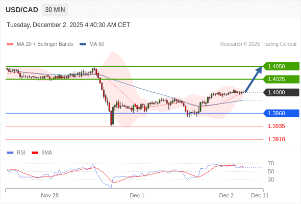 在 1.3960 之上,看涨,目标价位为 1.4025 ,然后为 1.4050 。