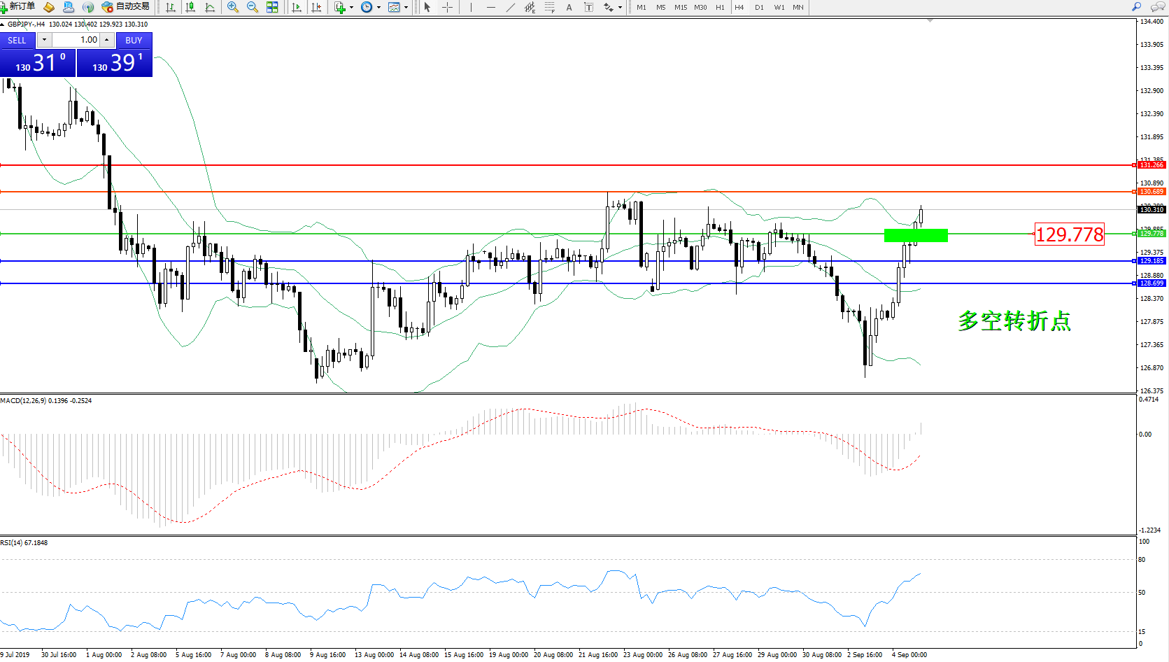 备选策略:129.778上方看涨,目标130.689131.266