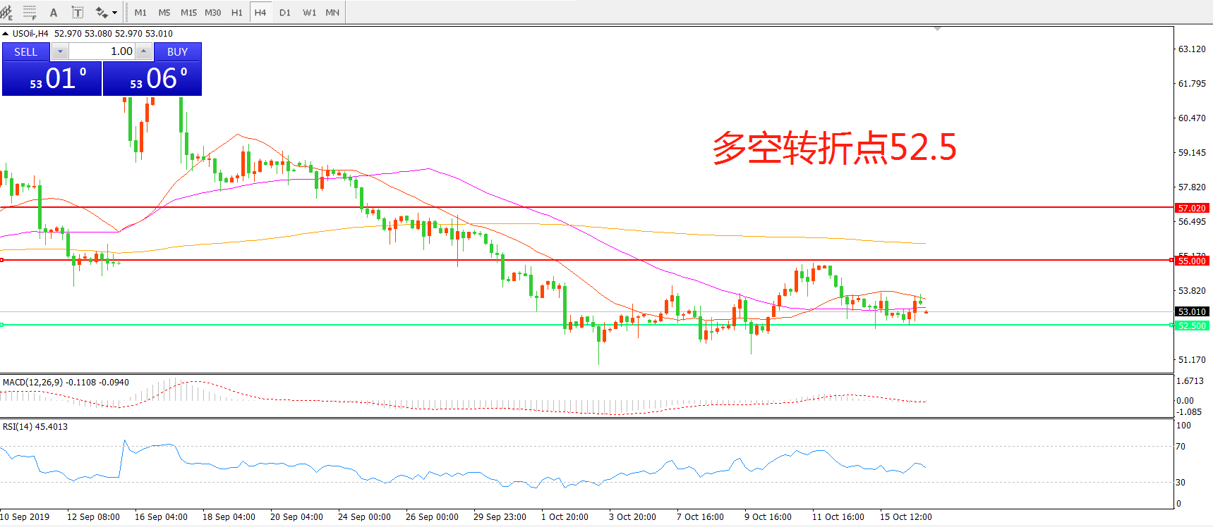 4小时图看,油价延续窄幅震荡,21周期均线成为短期阻力,52.5成为下方支撑,MACD红柱缩短,RSI指标拐头向下,日内延续震荡概率较大。