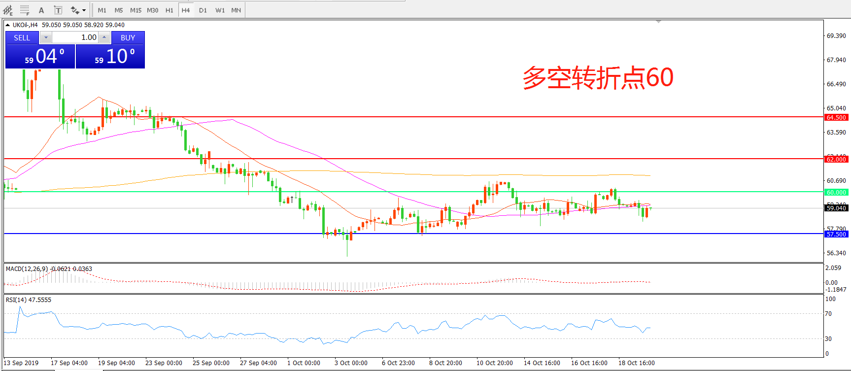 周一(10月20日),英国议会依然未能就新版脱欧协议举行投票,这令最终能否有协议脱欧通过成疑,而全球经济放缓迹象令投资者对供应过剩担忧重燃,美国油服公司贝克休斯上周公布数据显示,美国石油活跃钻井数增加1座至713座,利空油价,布伦特原油维持低位震荡,最终收报59.04美元/桶。