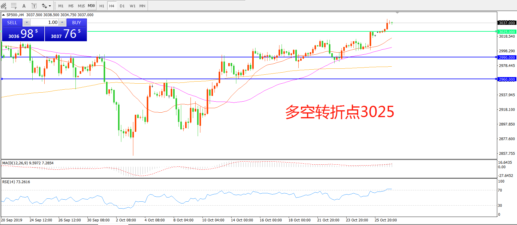 4小时图看,标普500延续上行走势,突破3025后再创新高,整体走势偏强,均线系统呈多头排列,MACD红柱减少,RSI指标走平,日内延续上行概率较大。