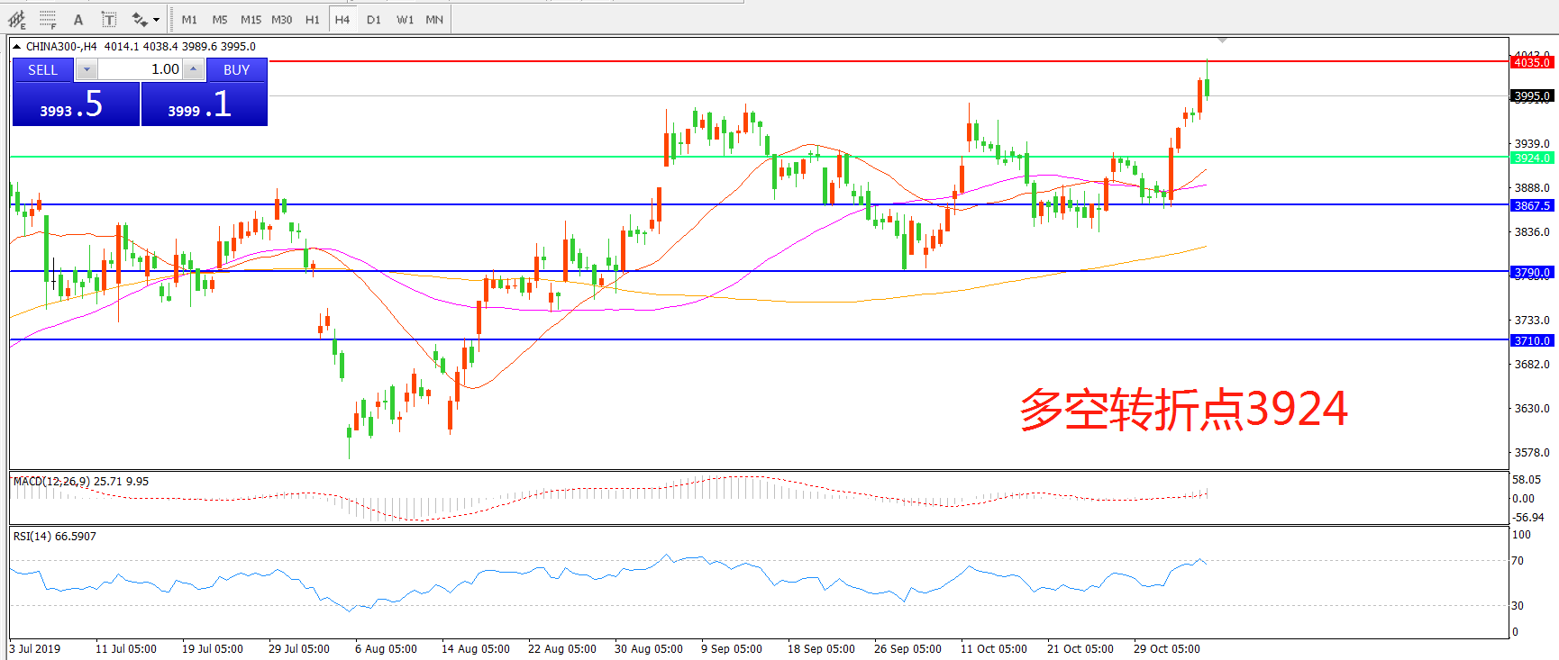 4小时图看,沪深300触碰4035阻力后小幅回落,整体走势偏强,均线系统有拐头迹象,MACD红柱增加,RSI指标走平,日内延续上行概率较大。