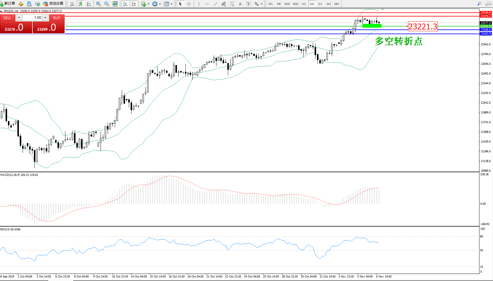 日经225指数11月6日(周三)收盘上涨39.51点,涨幅0.17%,报23291.50点。随着消费税上调的影响逐渐显现,日本经济有可能在第四季陷入萎缩。日本7-9月国内生产总值(GDP)环比年率料为增长0.8%,相当于较前季小幅增加0.2%。 此前第二季经济成长环比年率和较前季增幅修正后分别为1.3%和0.3%;民间消费为经济带来帮助,但经济增长可能有限,因为出口依然疲弱,而且企业控制旗下工厂的产出,调查显示,占GDP约六成的民间消费在第三季料增加0.6%,升幅与第二季持平。调查显示,第三季资本支出可能增加0.9%;第二季为增加0.2%;