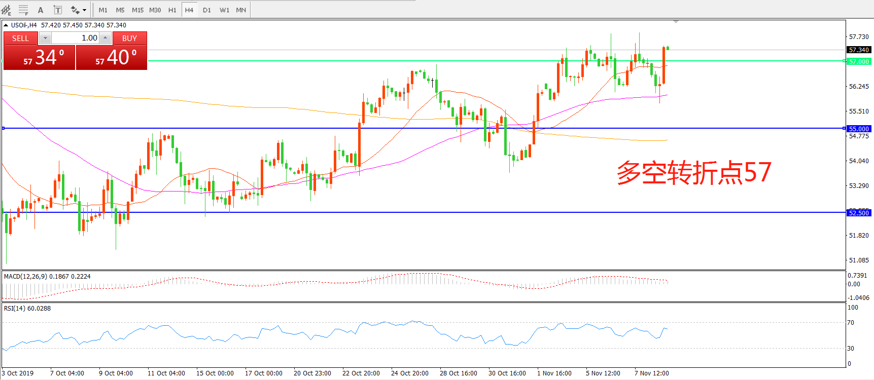 4小时图看,油价触碰55周期均线后强势反弹,上行趋势明显,均线系统走平,MACD红柱减少,RSI指标走平,日内油价延续上行概率较大。