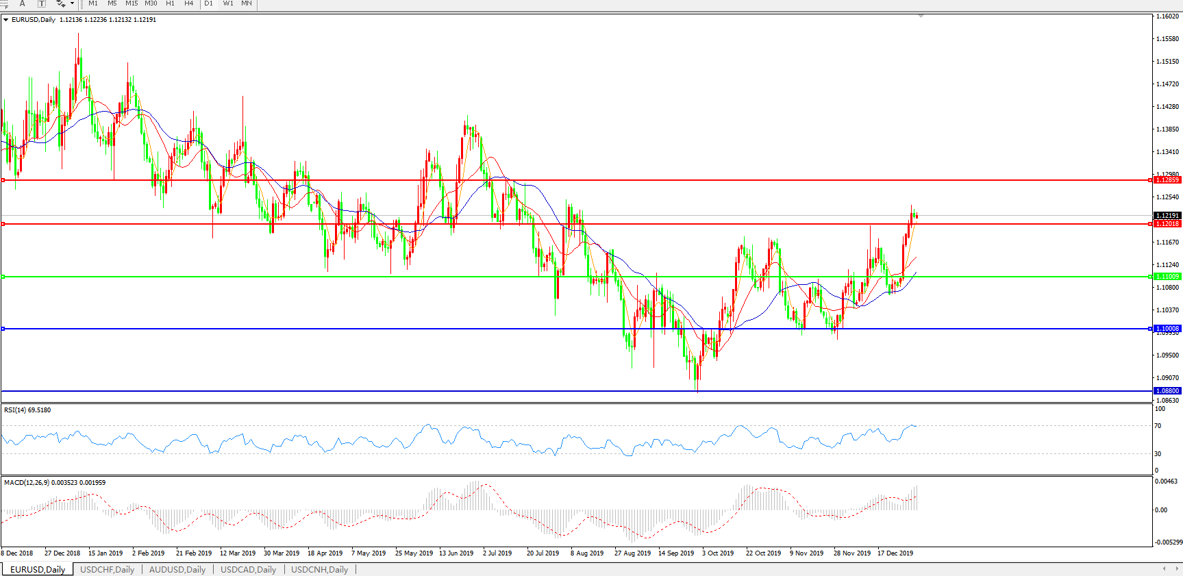 技术面简析:日图均线呈有序多头排列,汇价站上1.12关口并维持强势盘整,MACD再度上行且量能快速放量 ,RSI震荡中有趋弱迹象,预计汇价大概率将进一步上行,重点关注1.12关口的短期争夺。