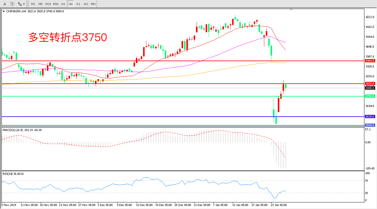 4小时图看,沪深300阳线连续拉升,整体表现强势,3825成为短期阻力,均线系统走平,MACD绿柱缩短,RSI指标向下,日内延续上行概率较大。