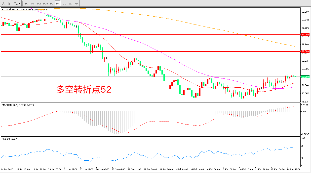 4小时图看,美油震荡企稳,底部形态初现,52美金成为多空分水岭,整体走势有回暖迹象,短期均线拐头向上,MACD红柱增加,RSI指标走平,日内震荡上行概率较大。