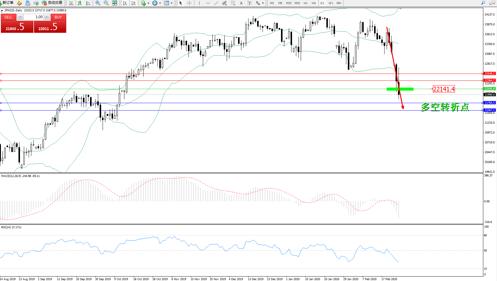日经225指数2月25日(周二)收盘下跌784.74点,跌幅3.36%,报22602.00点。日本2019年第四季度实际GDP较第三季度收缩6.3%,远低于预期,并且是自上一次于2014年4月上调消费税以来的最大降幅。日本最近的经济数据令人失望,并表明在2019年10月上调消费税和台风“双重打击”之后,日本经济遭受的损失比预期的要多得多。实际私人最终需求环比下降达到惊人的11.7%,该指标可以反映针对库存变化进行调整的私人部门的消费和投资,考虑到它的下降幅度几乎是GDP总值下降幅度的两倍,这也令市场感到担忧。不过庆幸的是其降幅小于2014年上调消费税后下降的水平。