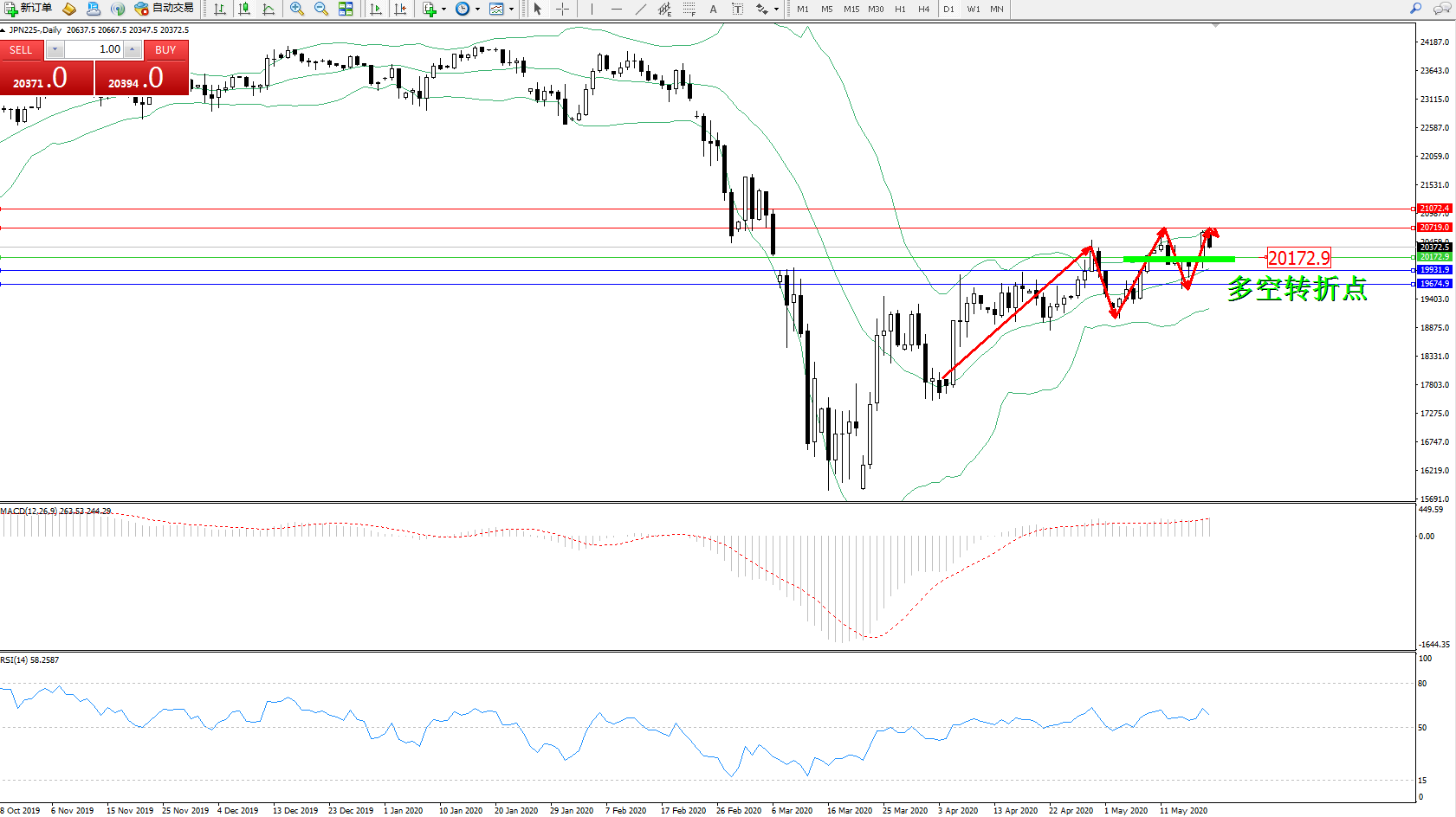 日经225指数5月19日(周二)收盘上涨330.77点,涨幅1.64%,报20464.50点。日本时事通信社报道称,日本自民党(执政党)的一个工作组提出10万亿日元的融资计划,帮助那些被视为对国家安全至关重要的公司保持竞争力;融资工具将包括次级贷款和优先股;正式决定将于周二做出,并将纳入自民党政策负责人岸田文雄的政府建议之中;日本政府计划在本月的第二次补充预算中反映这些提议。风险意愿增强令美元承压,因美联储主席鲍威尔表示愿意印更多美元,延长货币刺激措施,以对抗冠状病毒经济危机,令投资者感到鼓舞。