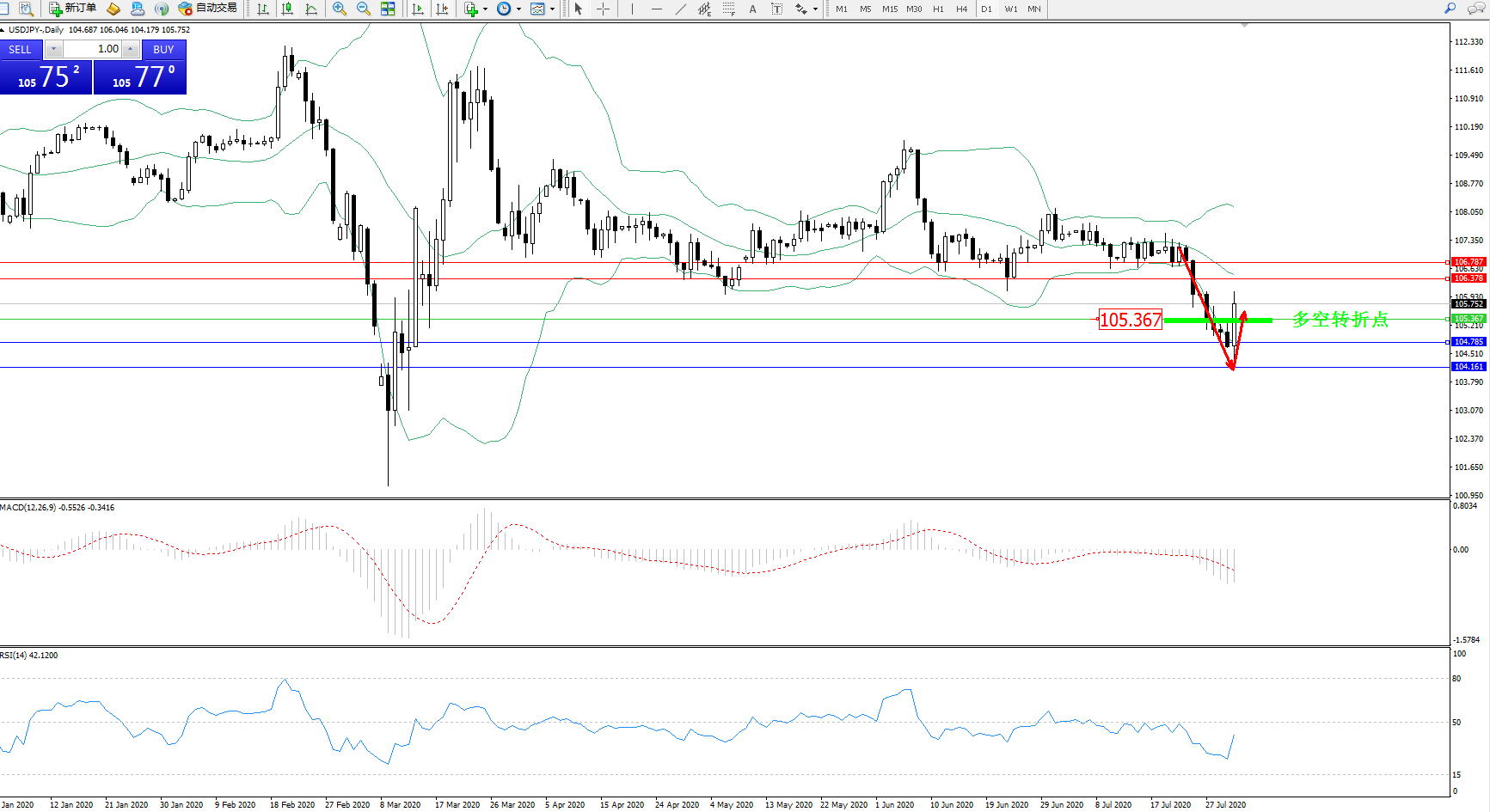 技术点评:高位空头动力延续布林带指标下轨持续弱势下行数日后,低位抵达104.161附近出现快速回升态势,拉升前期部分涨势,即将触及布林带指标中轨附近节点,布林带指标呈张口走势后以后收口迹象,MACD指标处于0轴线下方空头区域弱势整理震荡下移后开始平移,RSI指标处于空头动力持续震荡下移后出现快速拉升走势;