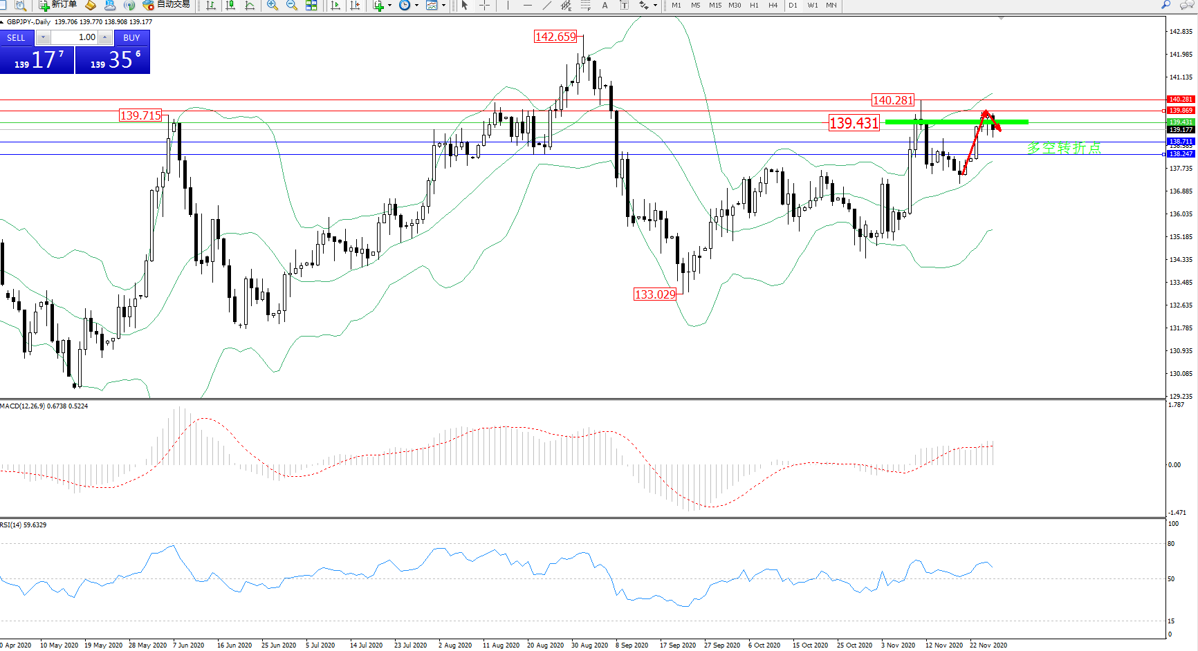 技术点评:多头动力处于布林带指标通道呃逆中上轨区间持续震荡上扬态势良好,呈阶梯向上移动持续中,布林带指标呈收口向上移动走势持续中,前期高位140.281位置近在咫尺却未能持续上行破位,MACD指标处于0轴线上方多头区域维持平缓移动后有继续上移迹象,RSI指标处于50均衡线上方多头区域维持整理平移中;