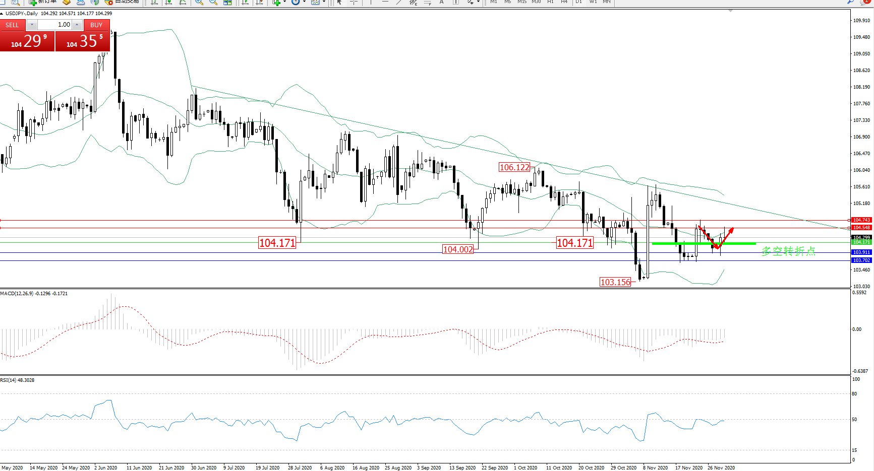 美元兑日圆处于104.299附近整理,因全球市场风险情绪在新冠病毒疫苗即将获批应用的预期下继续转暖,美国股指期货因而大涨,而避险货币日元的走势也因此承压走低;在当前消息面背景下,日元汇价缺少持续走强的动能,一方面日本央行已经做好了随时入市干预的准备,另一方面在美国大选之后全球各种负面消息源也已被市场消化完毕。眼下,投资者一方面对疫苗的应用结束全球疫情充满期待,一方面英国脱欧谈判等消息面也传出利多,这对于避险日元而言是持续的压力源;东京奥组委内部人士透露,东京奥运会防疫开销将花费大约1000亿日元,约9.6亿美元。由日本中央政府、东京都政府和东京奥组委三方人士组成的防疫委员会将在12月2日发表一份报告,公布奥运会期间的具体防疫措施。此前该委员会已经召开了5次会议,就防疫问题达成了基本的框架协议。