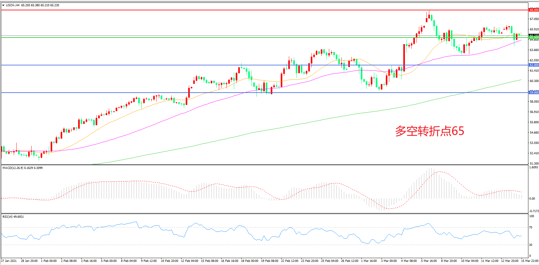 4小时图看,油价以55周期为依托延续高位震荡,整体波幅不大,65美元成为下方支撑,68美元成为短期阻力,MACD红柱缩短,RSI指标走平,日内延续震荡概率较大。