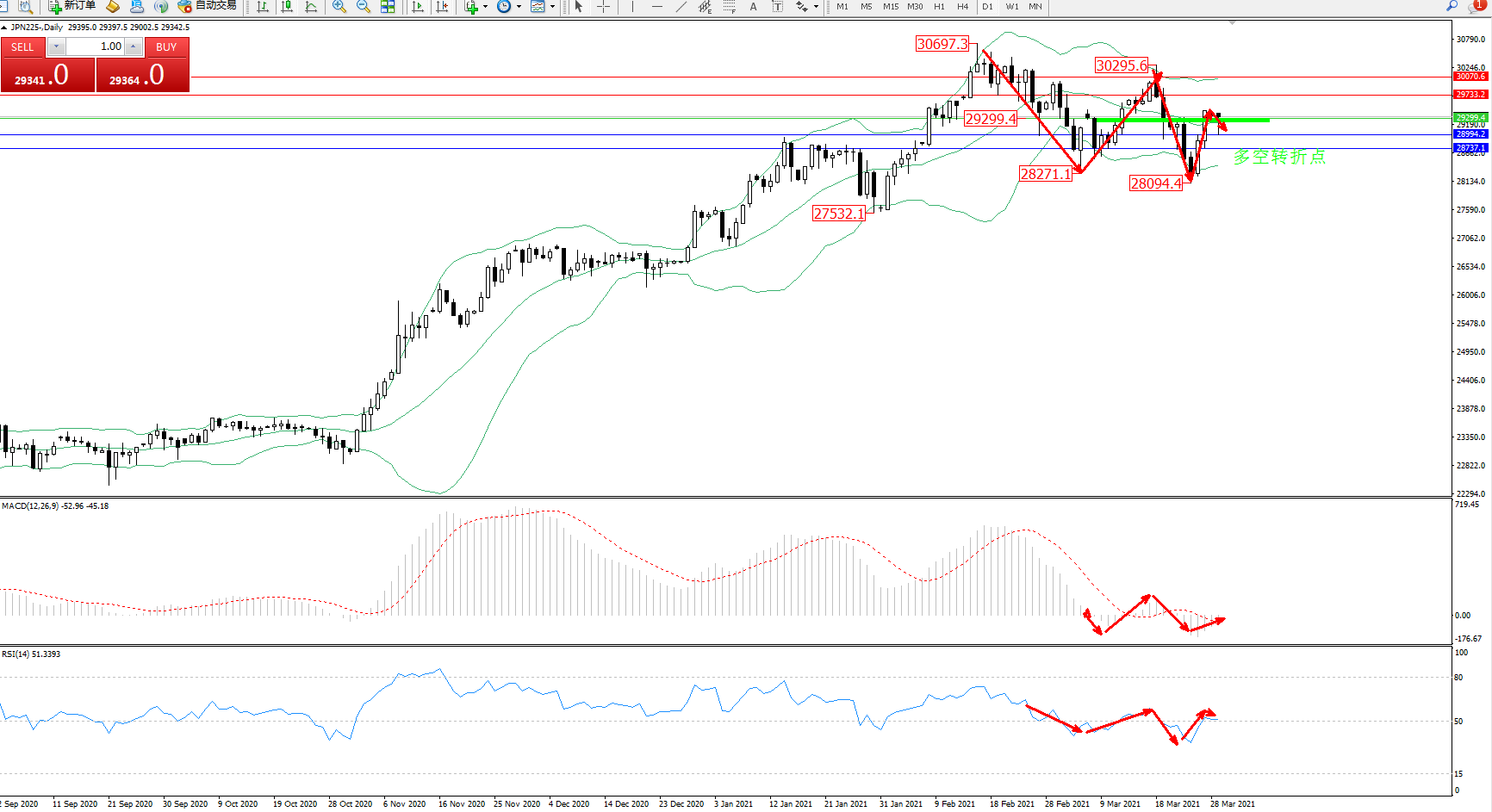 日经225指数3月29日(周一)收盘上涨154.30点,涨幅0.53%,报29331.00点。日本央行公布3月会议意见摘要显示,遭受疫情冲击的国内经济开始出现亮点,他们同时并讨论了使央行超宽松货币政策更可持续的举措。使其政策工具更加可持续,足以长期抵御疫情对经济的冲击,并将通胀率推向难以企及的2%目标。日本经济可能在摆脱自疫情爆发以来的下行趋势,出口和产出依然坚挺。尽管围绕疫情仍存在不确定性...但国内外经济活动面临的下行风险得到控制,没有迹象显示受累于商业环境恶化的行业增加。在物价方面,一些委员警告称通缩或长期物价停滞风险仍是日本央行的主要担忧,即使一些西方经济体出现通胀上升情况。 这些言论强化了主流的市场观点,即日本央行目前将维持货币政策稳定,希望海外需求反弹将支撑日本依赖出口的经济。希望对政策工具的评估将允许日本央行“未来几年”坚持当前的政策框架 。