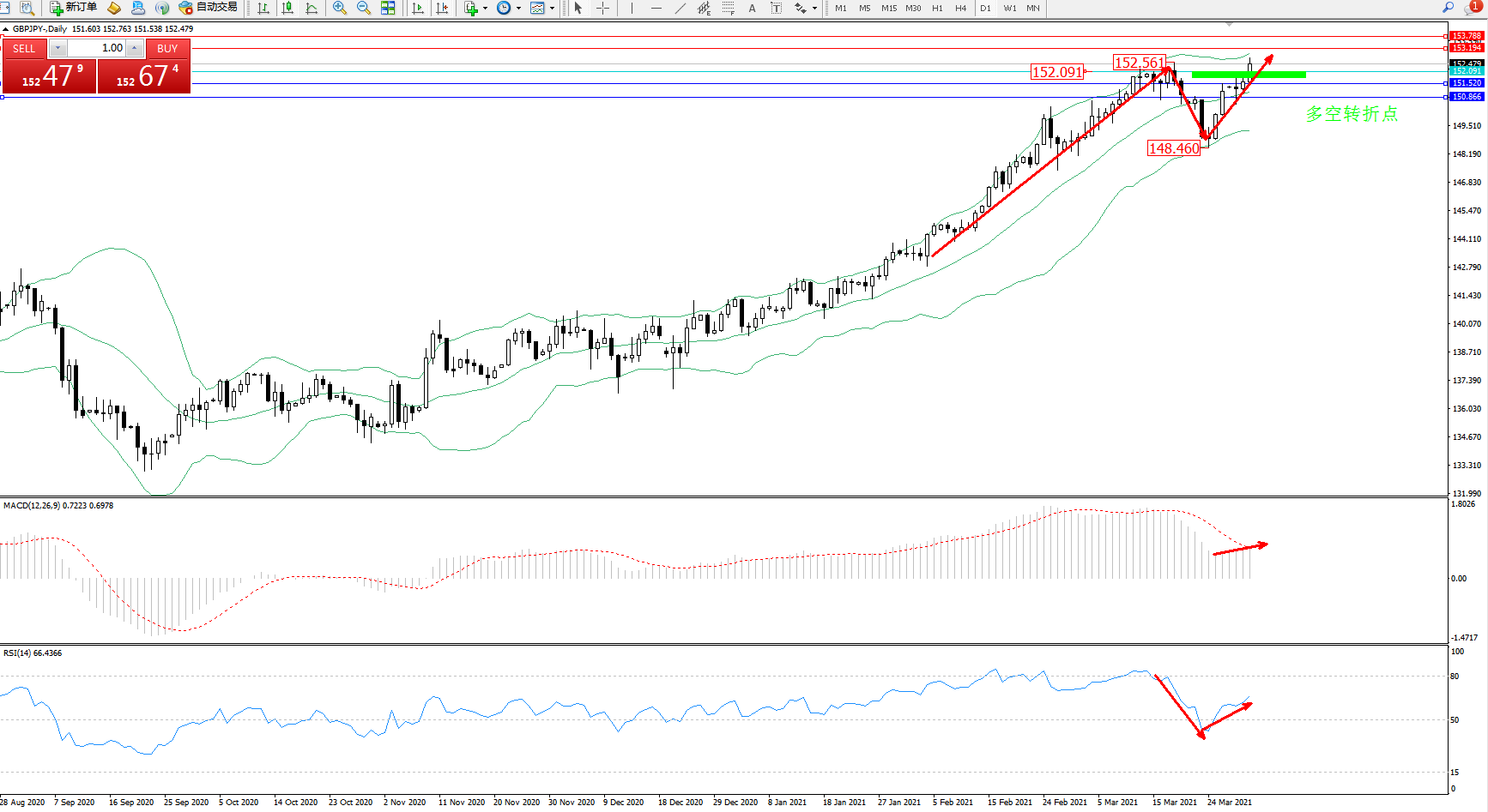 技术点评:多头动力延续布林带指标通道中上轨区间持续震荡上扬,高位抵达152.561位置后遇阻回撤,触及下轨148.460附近节点后多头动力强势反转上移,再度回升至上轨附近持续拉升中,布林带指标呈收口走势后开始缓慢平移中,MACD指标处于多头区域高位回撤后开始徘徊,RSI指标处于多头区域高位急速下挫后反转上移,开始整理平移;