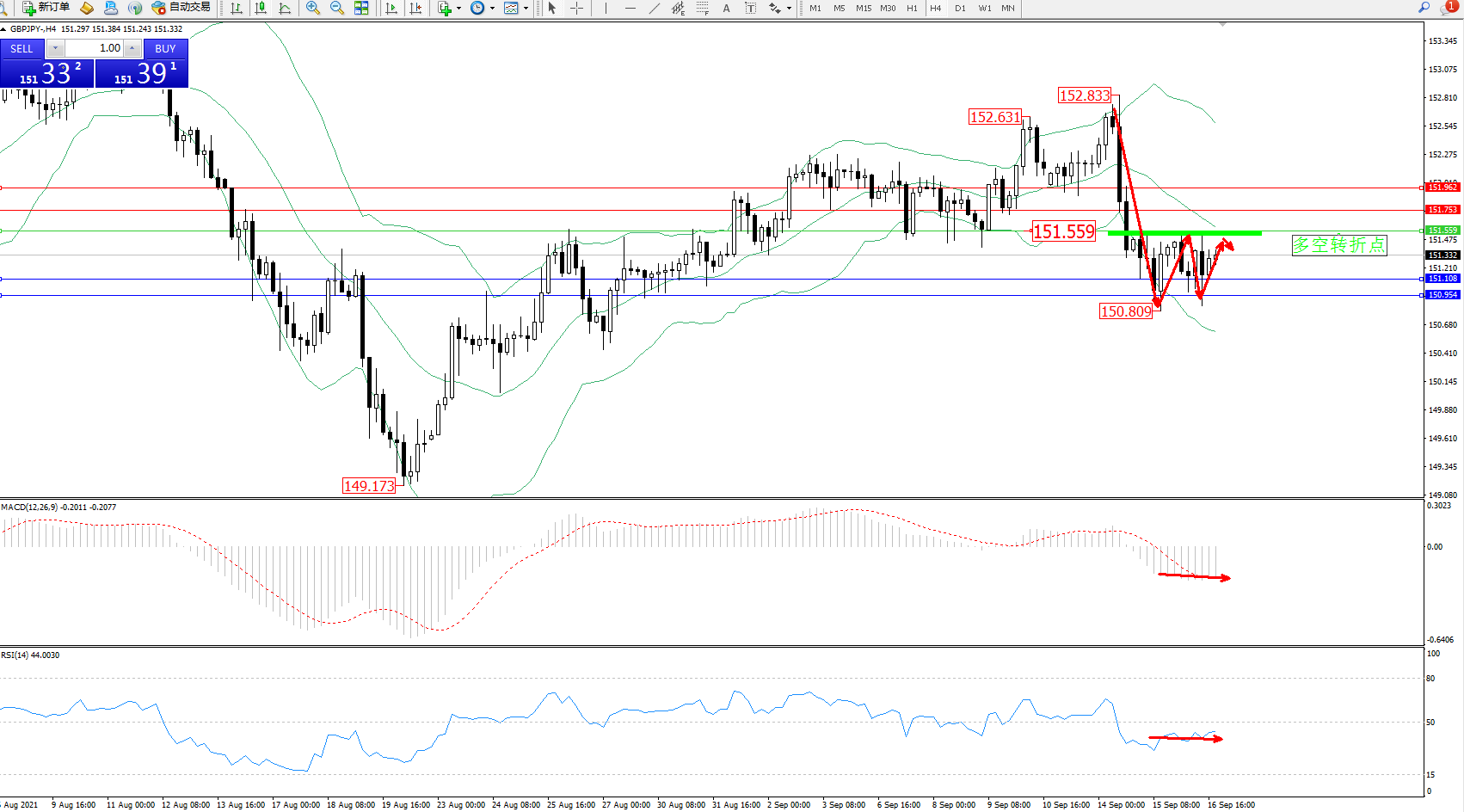 交易策略:151.559下方看跌,目标151.108、150.954